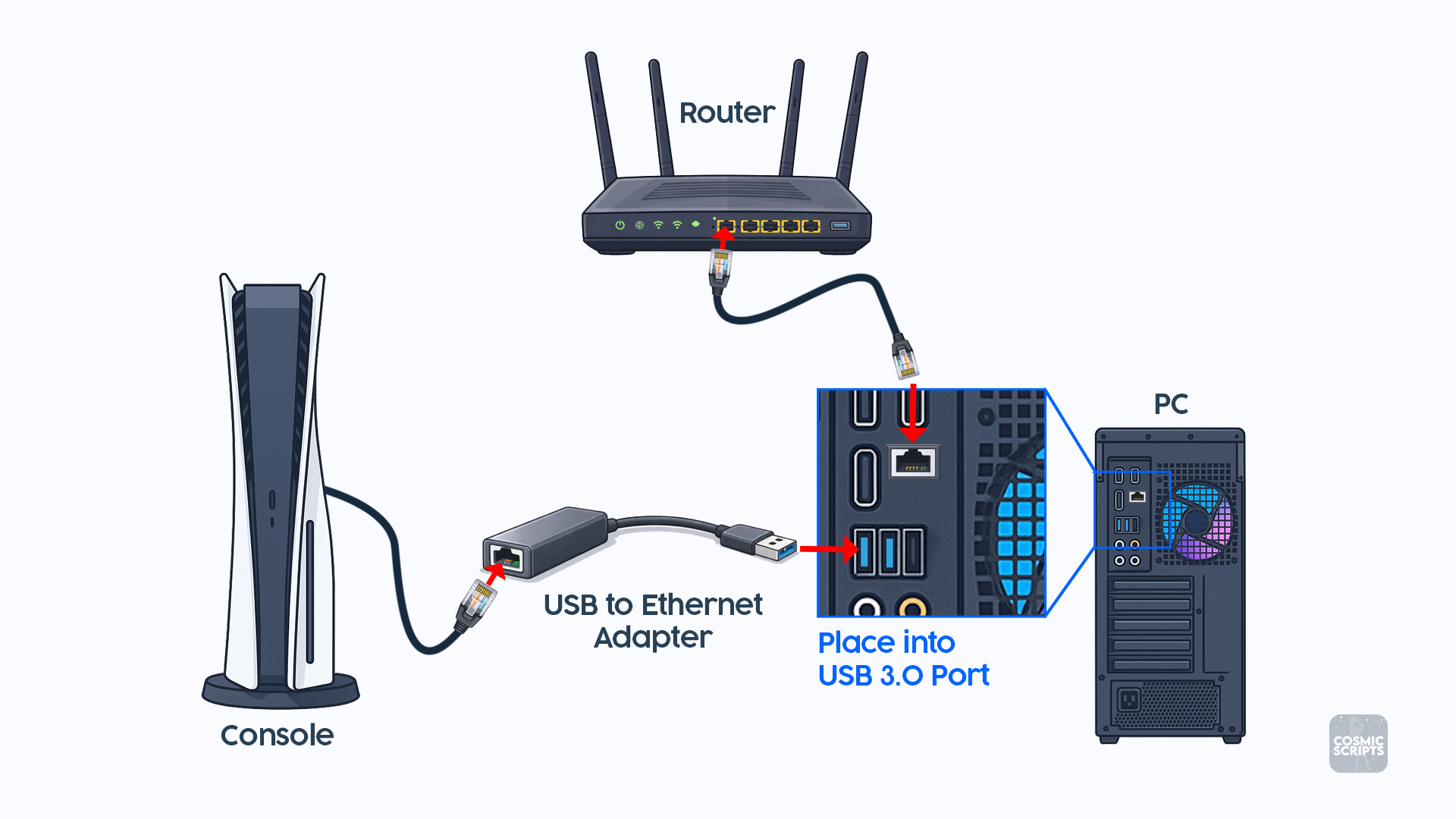 - USB-Ethernet Adapter into USB 3.0 Port (Blue)