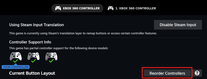 - Enable Steam Input (if disabled) and select Reorder Controllers